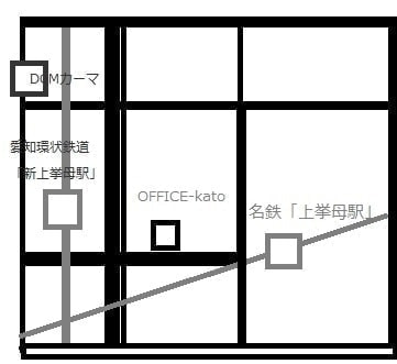 東名高速道路 豊田ICを下車し、土橋町1丁目交差点を左折(5分)そのまま直進し、上挙母4丁目交差点を右折。30m直進、上挙母バス停すぐの路地を左折。50m直進後、左手に二階建て事務所があります。